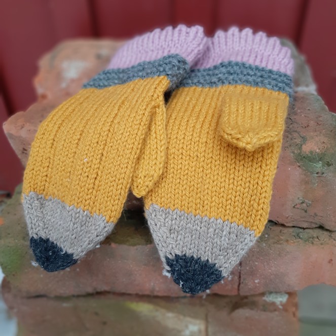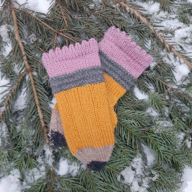 I år har det gått lite trögt i min tomteverkstad och jag har tillverkat blott en enda julklapp med mina egna händer. Det blev ett par vantar till min närmsta kollega. Jag kom på redan i början på november (ovanligt tidigt och framförhållit för att vara jag) att jag nog skulle tillverka något till min nya kollega. Jag flurade på olika modeller och mönster på vantar, för vantar skulle det bli, tills jag såg ett par strumpor svepa förbi i något socialt media. Strumporna såg ut som blyertspennor, ni vet, gula med ett rosa sudd i änden och valet blev självklart, det skulle stickas ett par pennvantar till min skolfrökenkollega. Är det något som det läggs energi på i vår bransch så är det just blyertspennor. Det är ovässade pennor (och var har alla pennvässare tagit vägen?), tappade pennor, avbrutna pennor, tuggade pennor, hamstrade pennor i små gömmor, pennor som nyss låg på någons bänk men inte längre gör det, men ändå mest av allt, pennor som är där de ska, faktiskt funkar och gör sitt jobb.