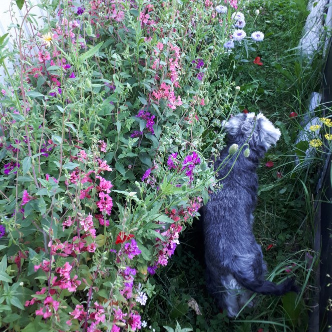 Bi-restaurangen blommar för fullt nu i alla möjliga färger. Än väntar jag med stor förväntan på att solrosorna ska blomma. (Gunsan tar skydd bakom de höga blommorna för det spelas fotboll på gården och det är ju bara för läskigt.)