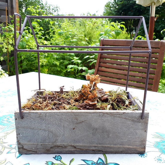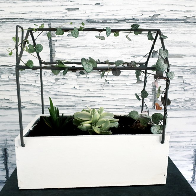 Jag drog på några lager halvblank vit färg på lådan och planterade två suckulenter och en plättar på tråd som fick slingra runt ”knutarna”.